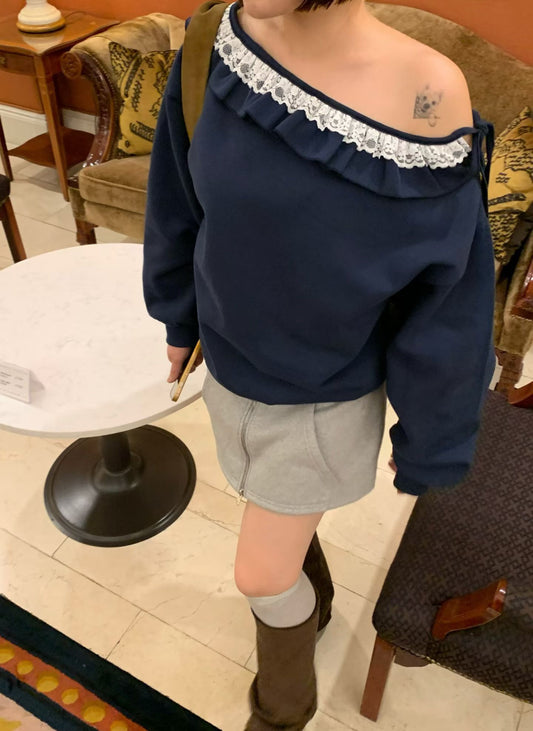 韓國特價款:off shoulder hoodie( navy/grey)